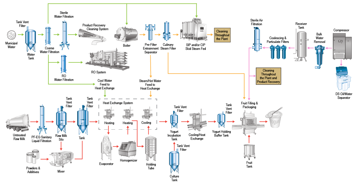 Wherever there’s a new step or ingredient introduced in your process line, you have new opportunities for contamination. Later additives may be flavoring or seasoning, preservatives, or emulsifiers. In soda, it’s carbonated CO2. Consider filters for each new ingredient—as well as for any new gas, steam, or air process involved. Each of these is a control point in food safety.